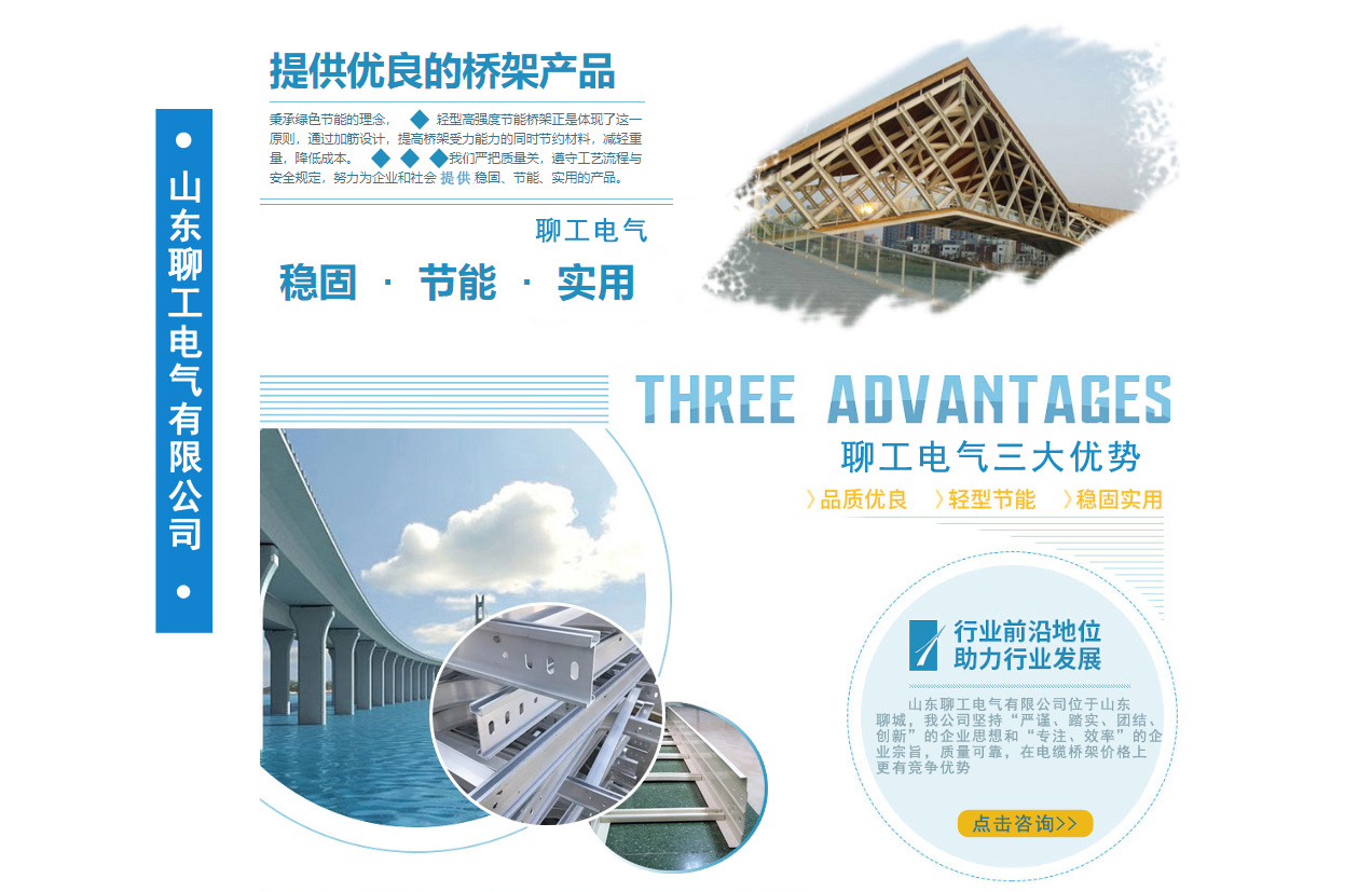 山東聊工電氣有限公司位于山東聊城,是一家銷售各類橋架的公司,公司主營鍍鋅防火噴塑橋架,鍍鋅防火電纜橋架 ,不銹鋼電纜橋架,熱浸鋅電纜橋架,鋁合金電纜橋架,熱鍍鋅電纜橋架,梯式電纜橋架等我公司堅持“嚴謹、踏實、團結、創新”的企業思想和“專注、效率”的企業宗旨,質量可靠,在電纜橋架價格上更有競爭優勢。公司追求品質,配有研發人員,進行產品的改革和創新,服務先進走出了一條富有企業特色的可持續化發展之路! 我公司鄭重向你承諾:保證最好的質量,以低的價格,完善的售后服務,來答謝新老客戶??商崆半娫捖撓?。...